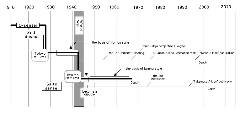 - Ritengo sia più facile comprendere la tavola cronologica dopo aver letto l’articolo scritto da Stanley Pranin nella prima parte di “Takemusu Aikido” Vol.1 (1994). Parallelamente io ho letto il libro “Ueshiba Morihei-den (Kisshomaru Ueshiba 1998, revisione di Moriteru Ueshiba 1998)(den significa biografia) e il libro “Aikido-ichiro (Kisshomaru Ueshiba 1995)(ichiro significa andare diritti su una Via). Entrambi illustrano cronologicamente la storia di O Sensei e, alla fine nelle ultime pagine, anche di Kisshomaru sensei. Vi ho trovato piena conferma della mia tavola cronologica.