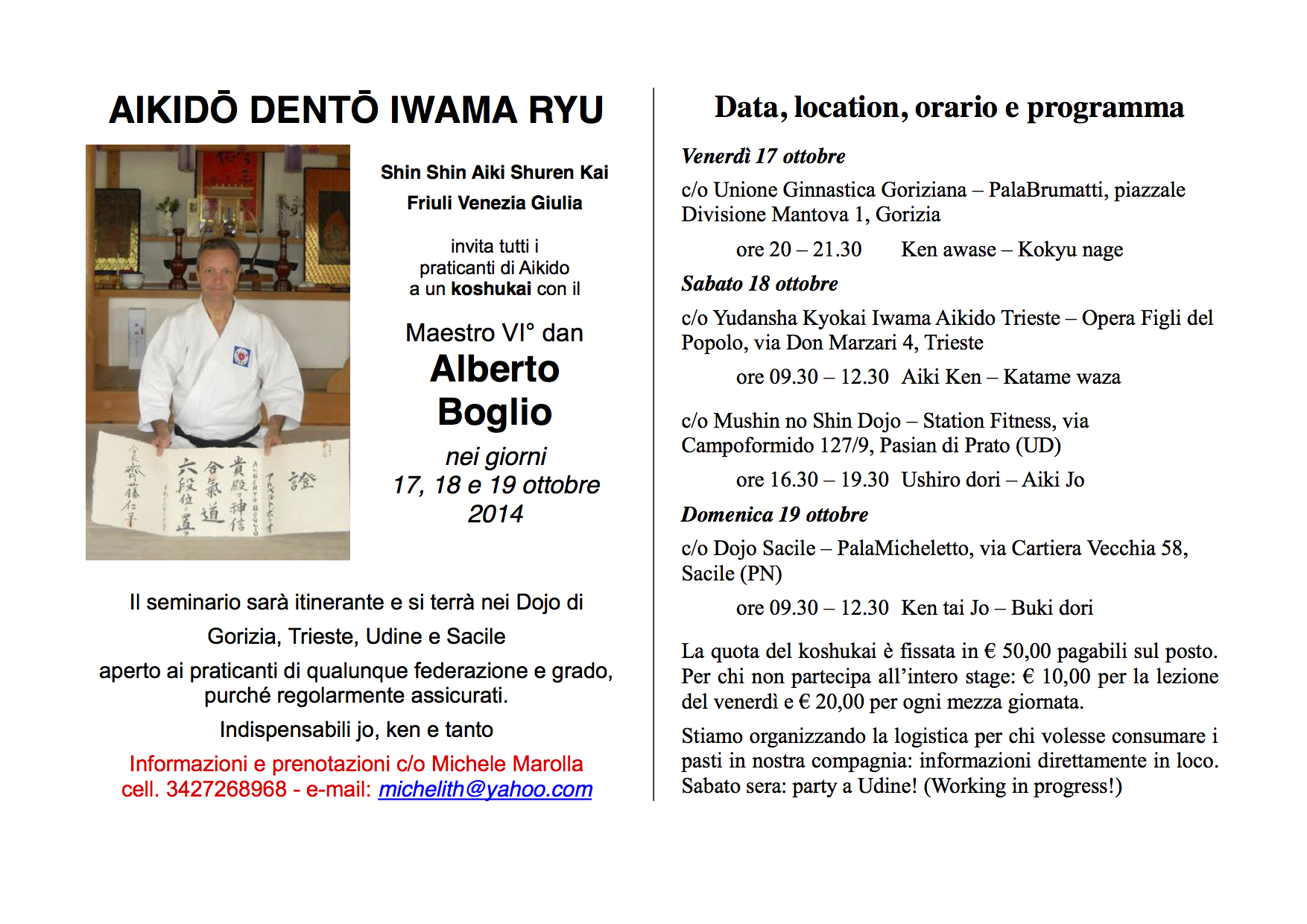 Aikidō Dentō Iwama Ryu: lo Shin Shin Aiki Shurenkai del Friuli Venezia Giulia invita tutti i praticanti di Aikido a un koshukai con il Maestro VI dan Alberto Boglio nei giorni 17, 18 e 19 ottobre 2014.