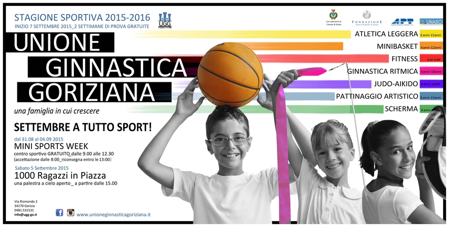 Anche quest’anno, forte del grande successo riscosso nelle passate edizioni, l’Unione Ginnastica Goriziana organizza la Mini Sport Week (dal 31 agosto al 4 settembre) e “1000 Ragazzi in Piazza” (sabato 5 settembre).
