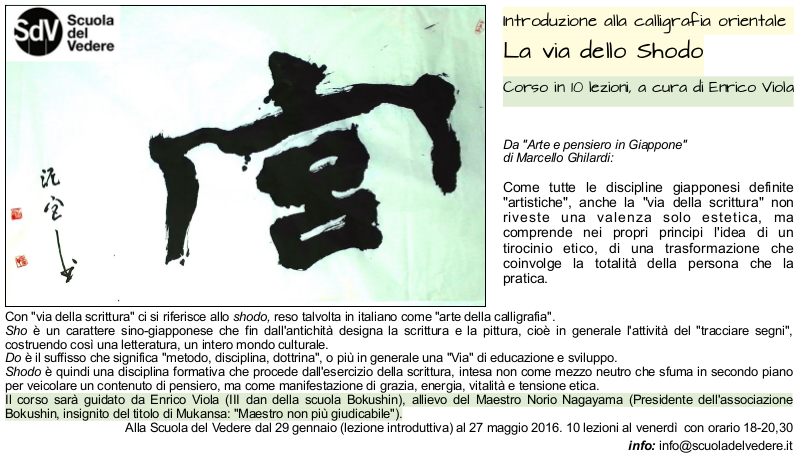 La Scuola del Vedere – Libera Accademia di Belle Arti di Trieste promuove un corso introduttivo alla calligrafia orientale: La Via dello Shodo, che sarà curato da Enrico Viola, III dan shodo Bokushin, allievo del Maestro Norio Nagayama) e sarà articolato in dieci lezioni tra il 29 gennaio (lezione introduttiva) ed il 27 maggio 2016.