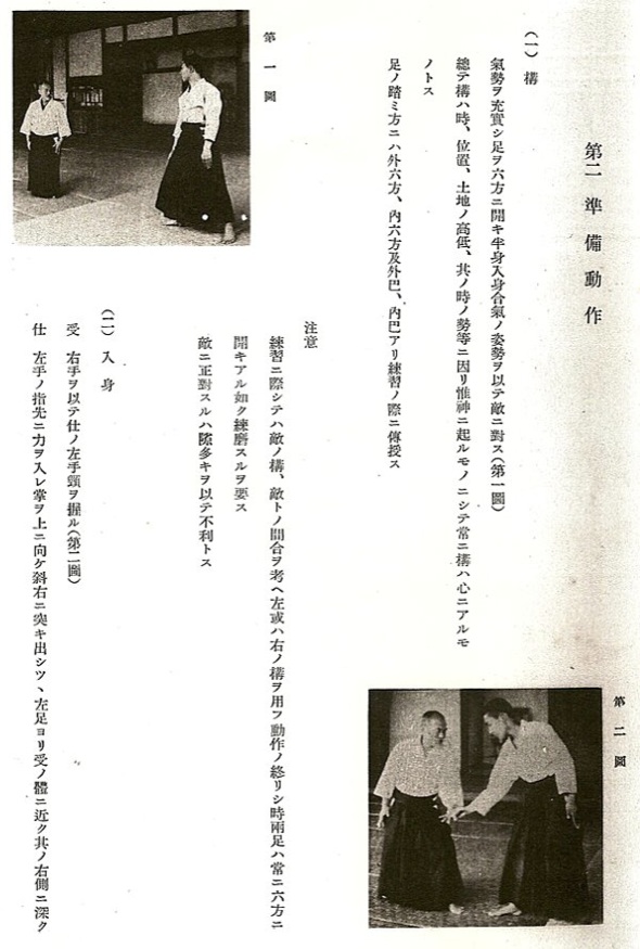 氣勢ニヲ充實シ足ヲ六方ニ開キ半身入身合氣ノ姿勢ヲ以テ敵ニ對ス(第一圖)