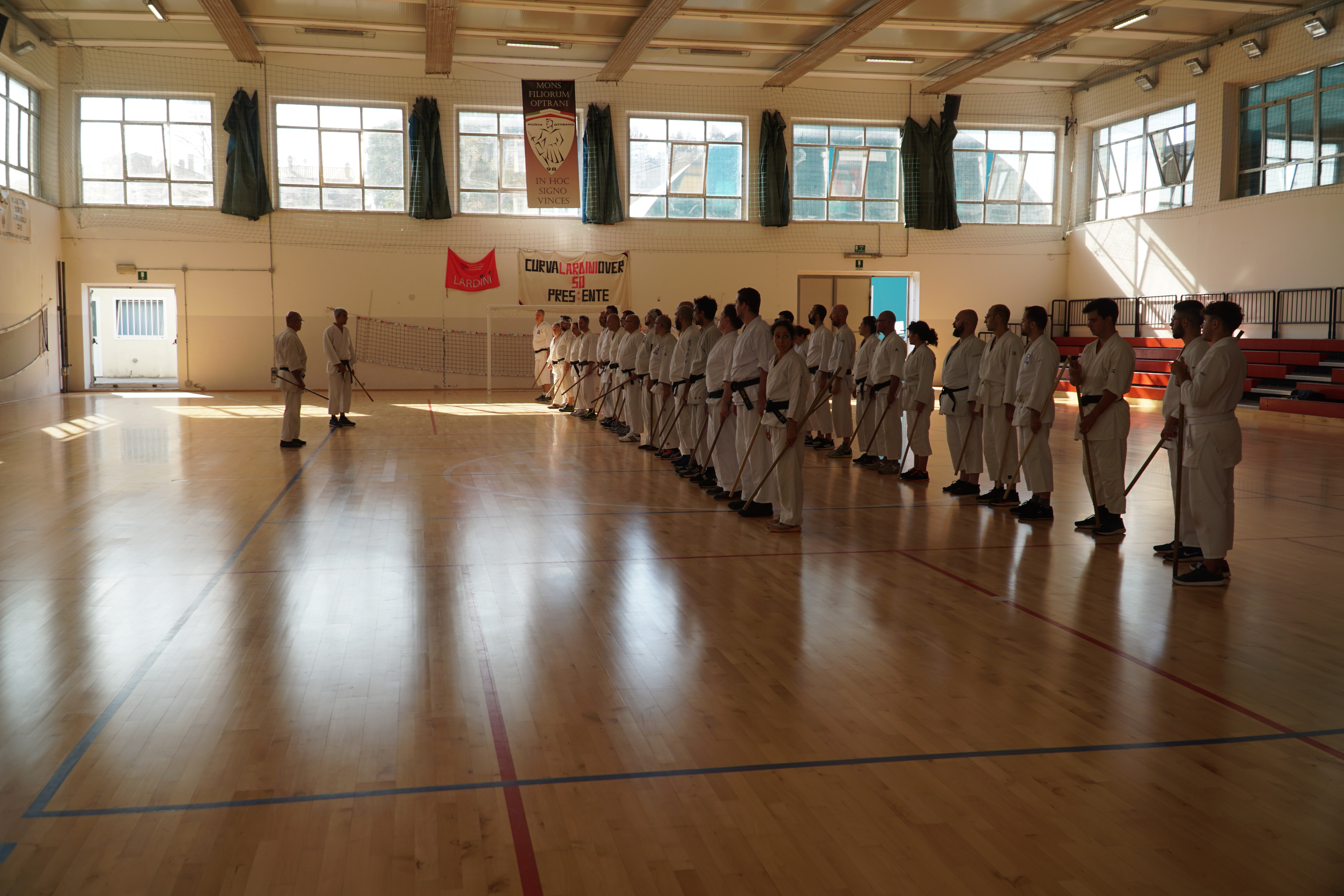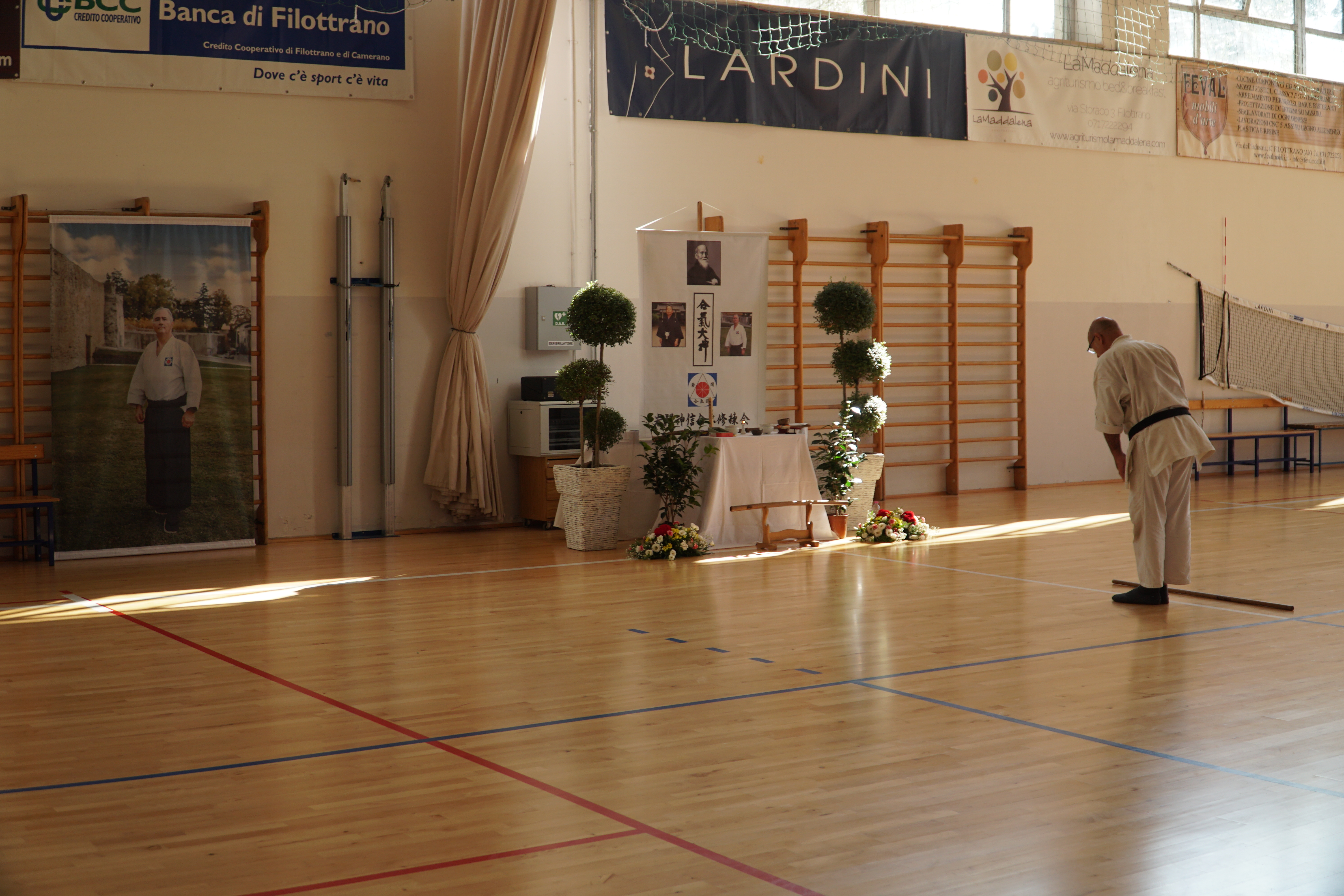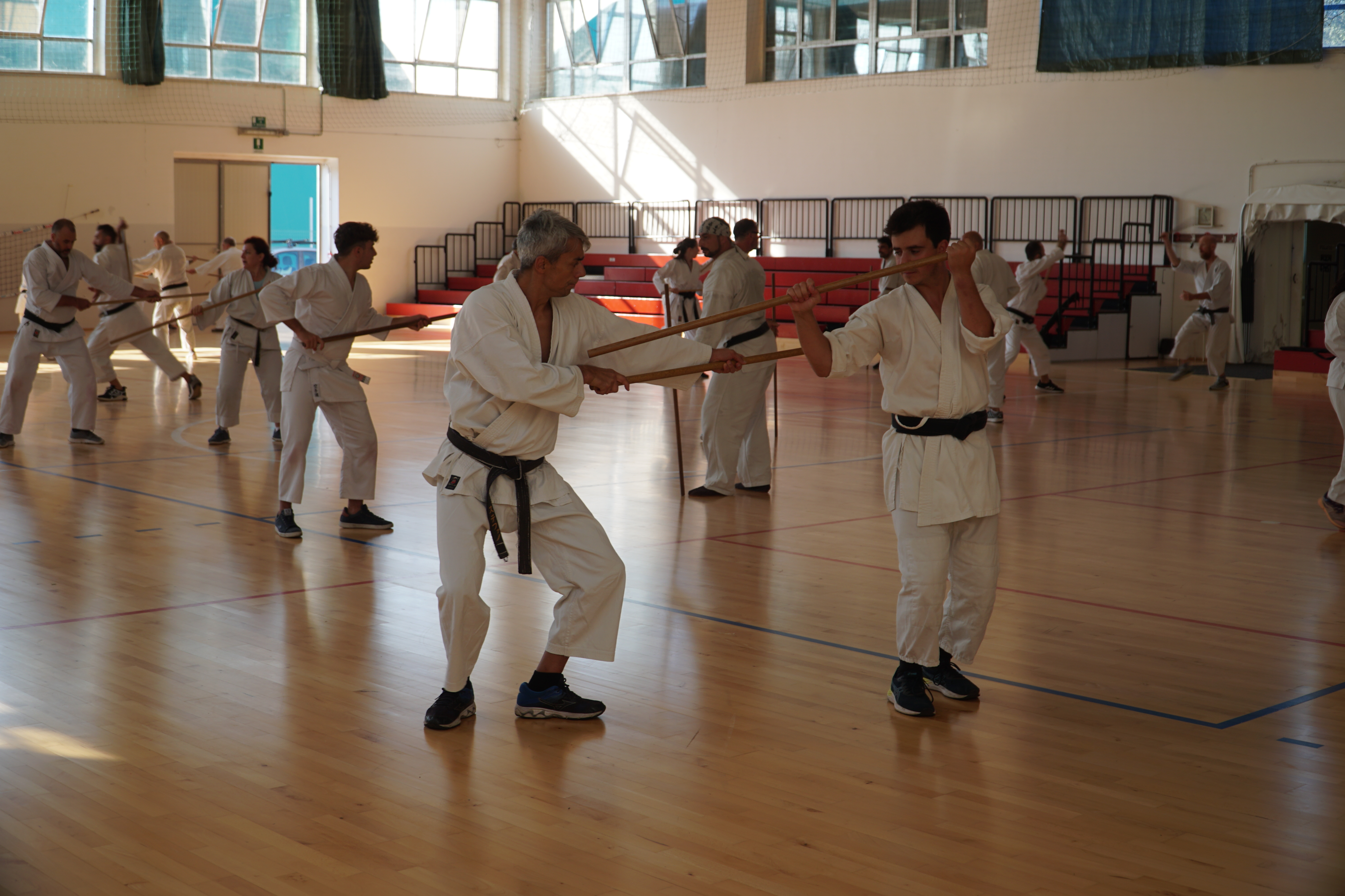 Il koshukai (seminario) si è articolato su una sessione di aikiken (la spada dell’Aikido, svoltasi sabato mattina all’aperto negli ampi spazi annessi all’Aiki Shuren Dojo Ancona) una sessione di taijutsu (ovvero lo studio delle tecniche a mani nude, svoltasi nella sala maggiore dell’dojo nel sabato pomeriggio) ed in un’ulteriore sessione di aikijo (lo studio delle tecniche del bastone dell’Aikido derivanti direttamente dall’antico patrimonio marziale della lancia giapponese, che si è svolta nel palazzetto sportivo di Filottrano nell’entroterra anconetano).