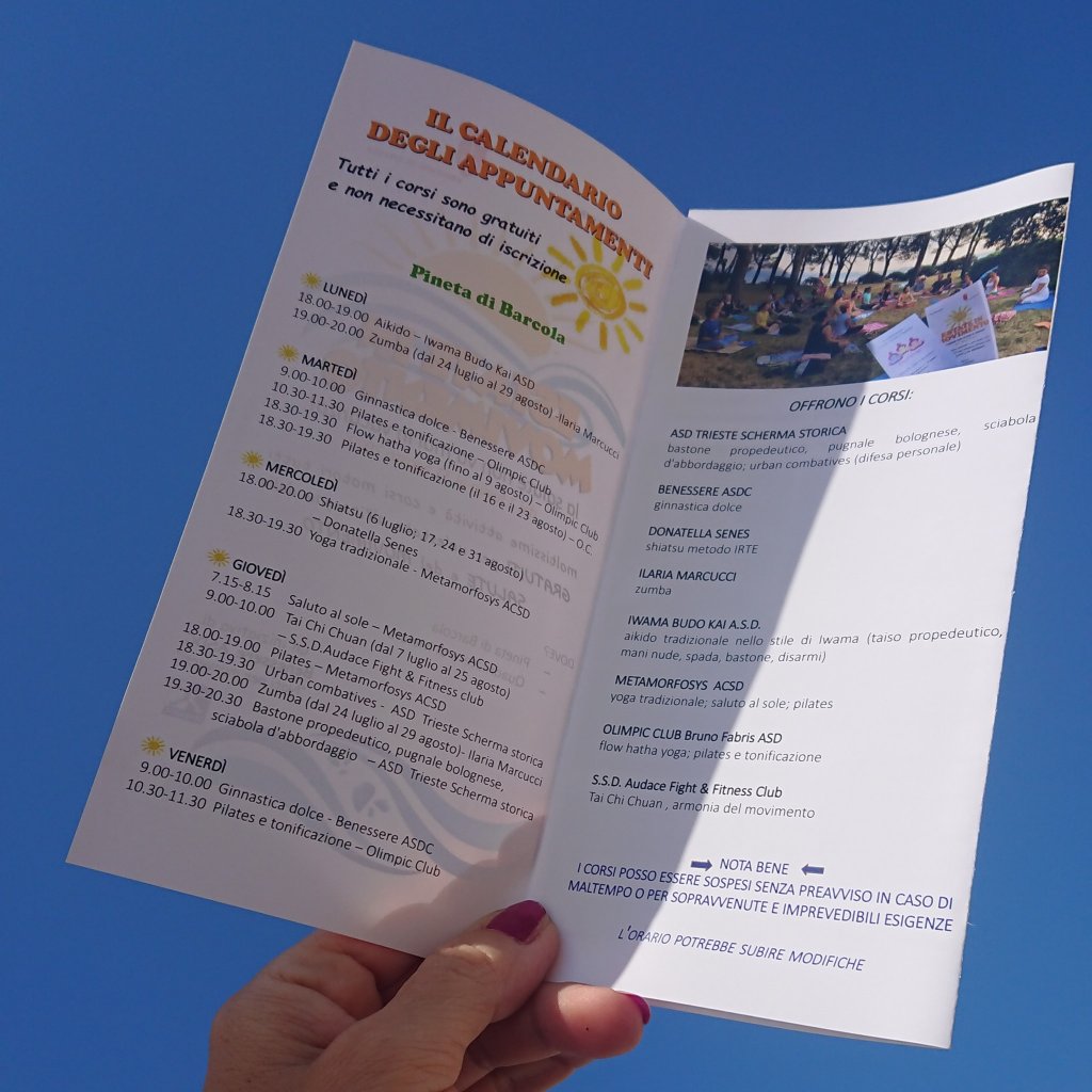 Estremamente variegata la proposta di attività che vengono offerte – rigorosamente in forma libera e gratuita – ai cittadini interessati di ogni età da parte di un ventaglio di realtà ed associazioni dilettantistiche del territorio: scherma storica [bastone propedeutico, pugnale bolognese, sciabola d’abbordaggio, urban combatives] grazie a ASD Trieste Scherma Storica; ginnastica dolce grazie alla stessa Benessere ASDC; Shiatsu metodo IRTE grazie all’insegnate Donatella Senes; zumba grazie all’insegnante Ilaria Marcucci; Aikido Tradizionale della Scuola di Iwama [taiso propedeutico, mani nude, spada, bastone, disarmi] grazie all’Iwama Budo Kai asd; Yoga, saluto al sole e pilates grazie a Metamorfosys ACSD; Flow Hata Yoga, pilates e tonificazione grazie a Olimpic Club Bruno Fabris asd; Tai Chi Chuan grazie a Audace Fight & Fitness Club.