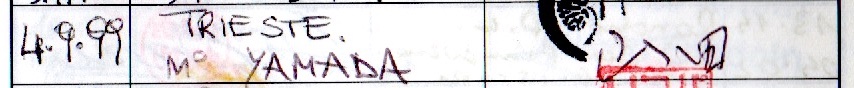 Del seminario ricordo poco, tranne l’impressione che mi fece il praticare sotto la guida di un maestro così famoso ed importante in una sala relativamente piccola: Yamada sensei guardava ed assisteva nella loro pratica tutti i presenti, anche grazie al numero non elevatissimo dei partecipanti. Eravamo ospitati in una delle palestre secondarie del Palasport di Chiarbola. Ricordo la cortese semplicità di Yamada sensei, una strana miscellanea di giapponese sinteticità e di quella schiettezza fraterna che generalmente connota gli americani: in una pausa stavo uscendo dal palazzetto dopo che era girata la voce che non sarebbero stati raccolti i libretti personali per sottoporli alla firma del maestro. Non so il perché. Incontrai Yamada sensei sulle scale, mentre si stava godendo il sole di fine estate in attesa di spostarsi per il pranzo; avevo con me il mio budopass e pensai di cogliere l’attimo: con il mio inglese limitato e grezzo chiesi Sorry Sensei, can you stamp? Egli sorrise cortesemente e, borbottando un fugace ‘course!, autografò il libretto che gli porgevo.