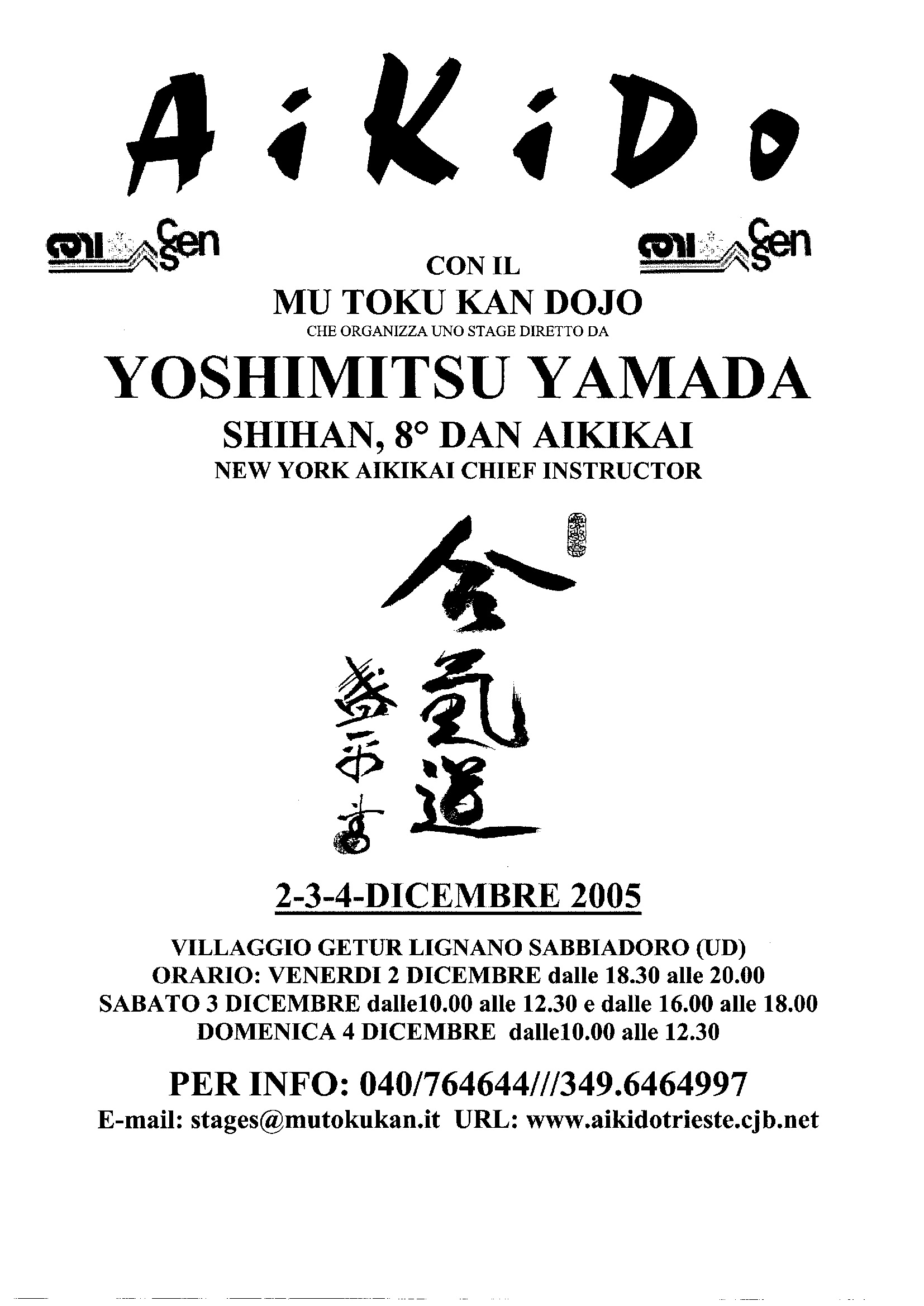 Ebbi per altre due volte l’occasione di frequentare un seminario diretto da Yamada Yoshimitsu Shihan: a Trieste nel settembre 2000 – stavolta il numero dei partecipanti si era decuplicato ed eravamo ospitati, a stento, nella sala principale del Palazzetto dello Sport, l’allora struttura sportiva indoor di punta della città – e nel dicembre 2005 a Lignano Sabbiadoro (UD), entrambe le occasioni organizzate dal m° Chiancone del Mutokukan Dojo. Ricordo bene che, a Lignano, il numero dei partecipanti era molto consistente, ed una parte del keiko venne affidata ad uno degli allievi anziani di Yamada sensei, che aveva accompagnato il maestro da New York: quest’ultimo ci sfiancò con un allenamento davvero provante a suon di kokyunage. L’aikido di Yamada sensei, ricordo, pur proposto con una didattica ed una pedagogia differente da quella di Iwama – nella quale ero cresciuto ed alla quale ero più avvezzo – mi era piaciuto molto: dinamico, radicato, plastico ma efficace, non troppo dissimile dalle esecuzioni kinonagare dei senpai dell’Iwama-ryu.