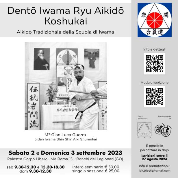 Sabato 2 e domenica 3 settembre 2023 il Maestro Gian Luca Guerra (5° dan Iwama Shin Shin Aiki Shurenkai, responsabile dell’Aiki Shuren Dojo Milano) ha diretto un koshukai (seminario) di Aikido Tradizionale della Scuola di Iwama – Dentō Iwama Ryu Aikido a Ronchi dei Legionari (Go) su invito di Enrico Neami dell’Aiki Shuren Dojo Trieste.