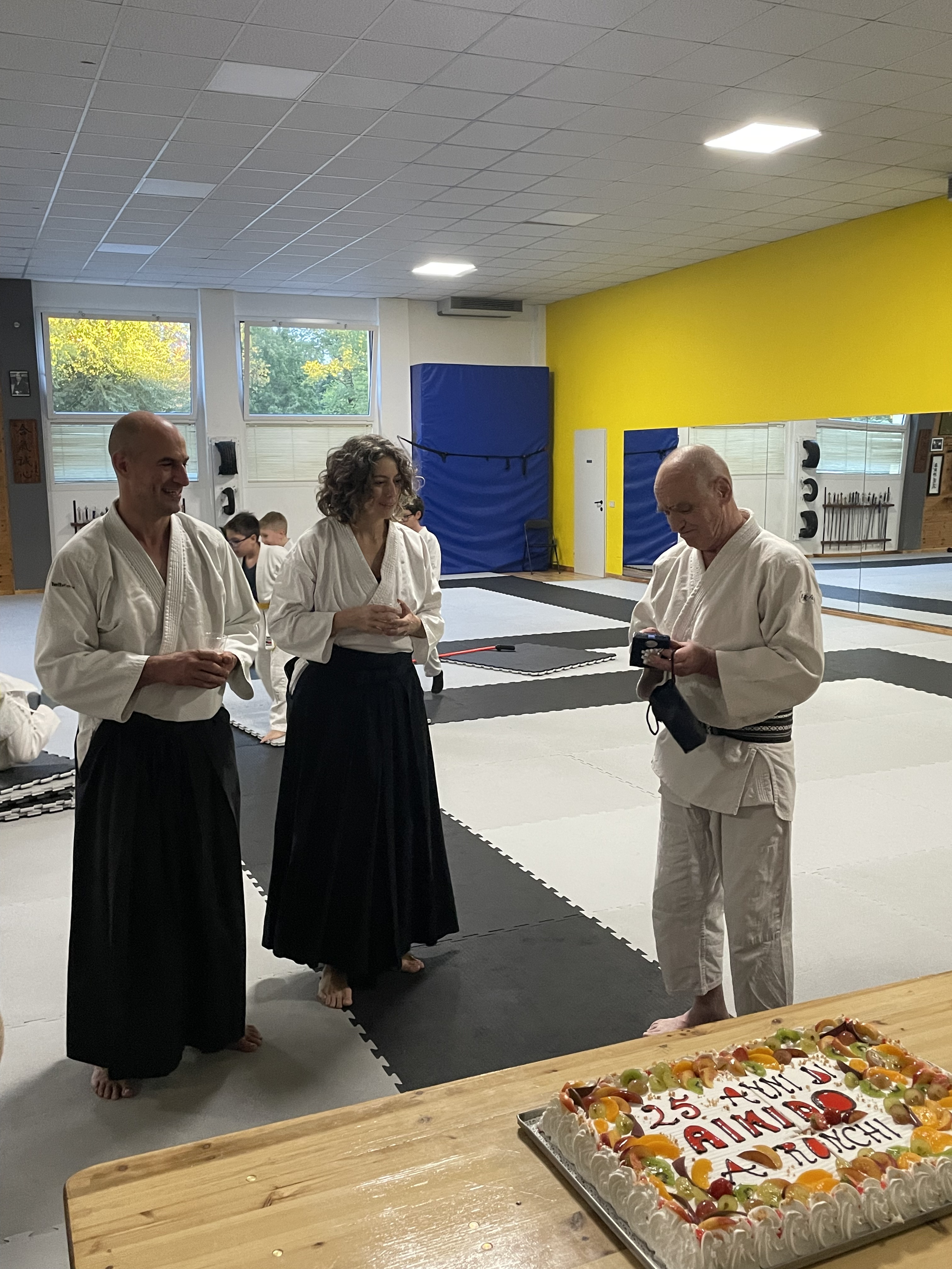 Come ricordato nel breve discorso introduttivo del maestro Benedetti, il corso di Takemusu Aikido a Ronchi dei Legionari è forse il più longevo tra le corrispondenti realtà attive sul territorio regionale: iniziato nel 1999 da Claudio Benedetti, prosegue ora, sotto la sua supervisione, grazie alla fatica, all’impegno ed alla costanza dei maestri Raccovelli e Corbatto. Sara Raccovelli, così come chi scrive, era presente alla lezione inaugurale di venticinque anni fa, mentre Maurizio Corbatto si unì al dojo di Ronchi pochi mesi dopo, ad inizio anno 2000.