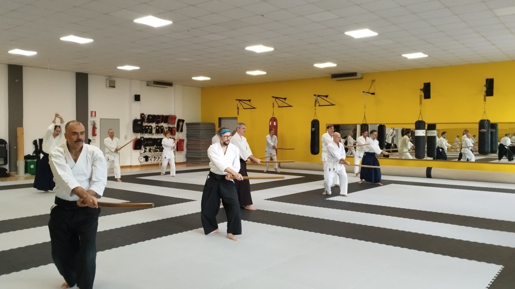 Il programma affrontato durante il seminario si è alternato, come da tradizione, tra sessioni di taijutsu (pratica a mani nude) e di bukiwaza (pratica con le armi tradizionali): sono stati affrontati i principi base di katatedori tai no henko, morotedori kokyuho, kotegaeshi, shihonage e iriminage, oltre a numerosi kokyunage, e, poi, i suburi dell’Aikiken come trasmessi direttamente dal Fondatore Ueshiba Morihei O Sensei a Saito Morihiro Shihan (Kaiso jikiden Morihiro Shihan ken suburi nanahon), le armonizzazioni di base (migi, hidari, go, roku e shichi no awase) ed i kumitachi 1,2,3,4 e 5; i suburi dell’Aikijo, il kata delle 13 posizioni ed i kumijo 1 e 2 con numerose varianti. A concludere numerose tecniche di bukidori (difesa da attacchi armati) e l’analisi comparativa del riai tra taijutsu e bukiwaza, con particolare attenzione al bukidori appunto.