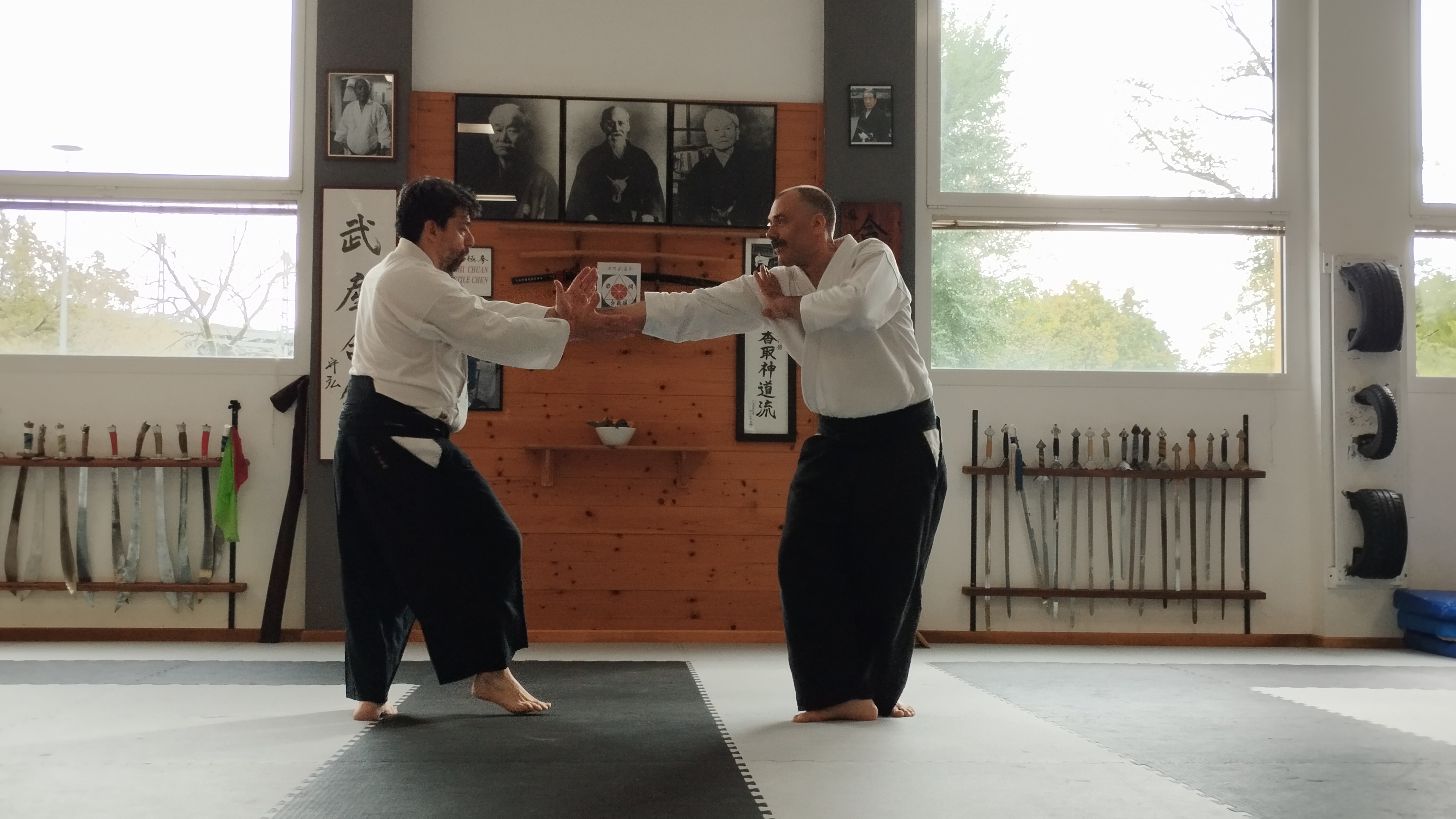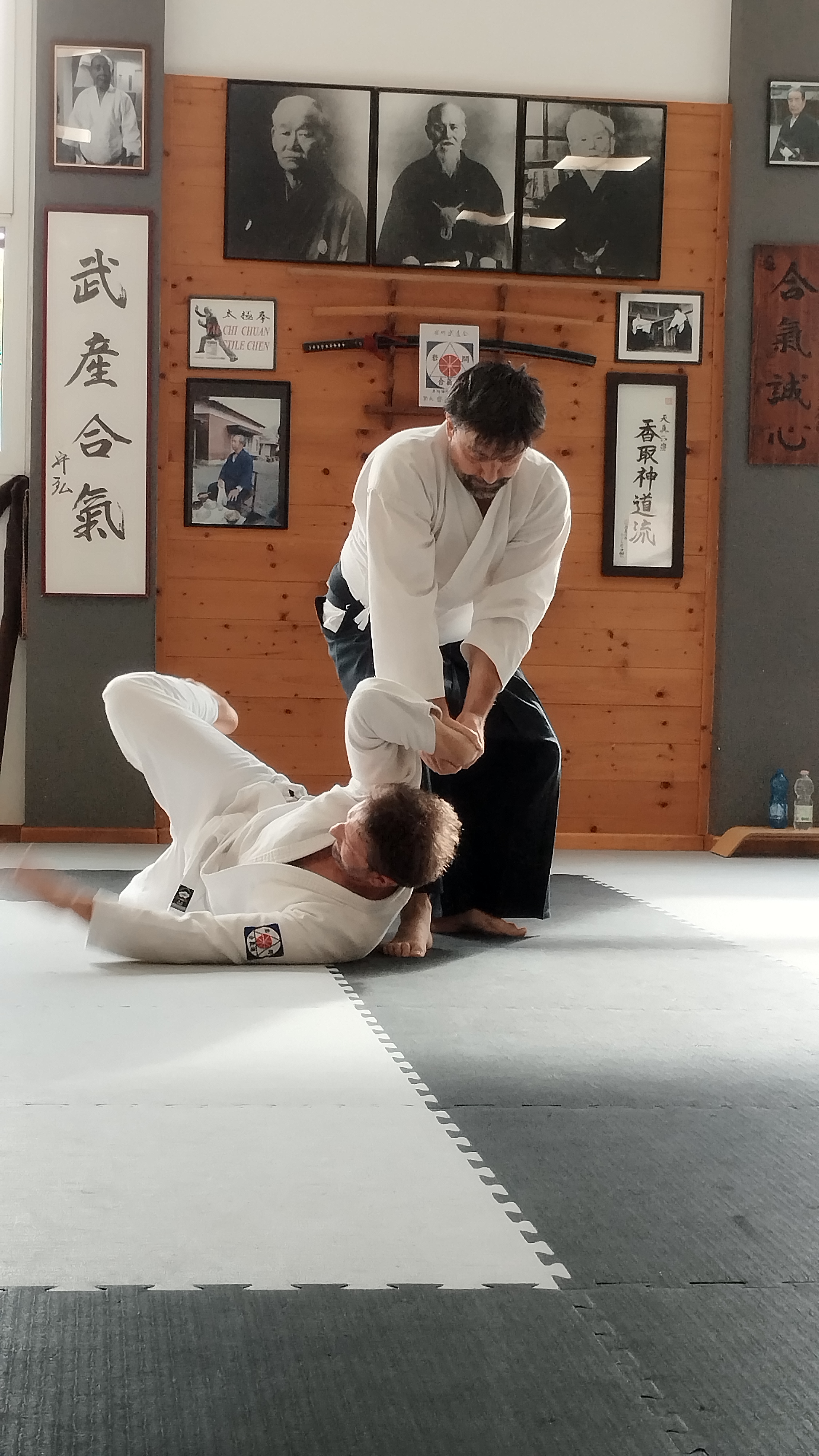 A latere delle sessioni di pratica sono anche state rievocati dagli stessi protagonisti eventi passati legati alle esperienze in qualità di uchideshi sotto la guida di Saito Morihiro Shihan: nel dojo di Ronchi fa infatti bella mostra di sé una magnifica foto del grande maestro, padre dell’attuale caposcuola Saito Hitohira Sensei, che venne scattata in Iwama proprio da Sergio Ravazzoni sensei, così come la calligrafia “Takemusu Aiki” che venne donata in originale da Saito Shihan al Maestro Giorgio Oscari e che, al tempo, venne scannerizzata e digitalizzata sempre da Sergio Ravazzoni sensei per consentire al maestro Oscari di donarne delle copie ai propri allievi più stretti, tra i quali il maestro Claudio Benedetti – il quale avviò il corso di Aikido a Ronchi 25 anni fa [vedi] – che l’ha poi lasciata al dojo ronchese.
