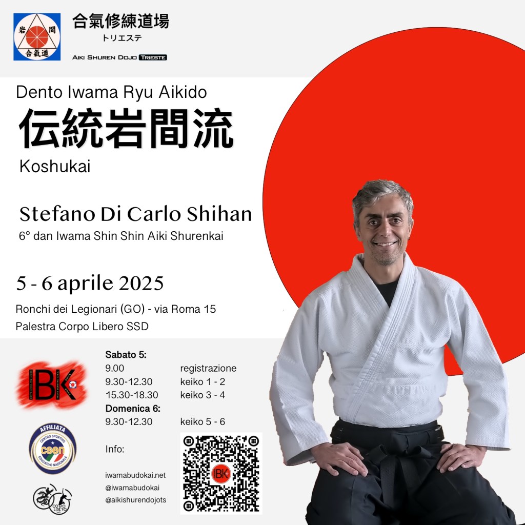 Nel fine settimana del 5-6 aprile 2025 il maestro Stefano Di Carlo Shihan (6° dan Iwama Shin Shin Aiki Shurenkai) ha diretto, su invito di Enrico Neami e dell’Iwama Budo Kai a.s.d., un koshukai (seminario) di Aikido Tradizionale della Scuola di Iwama – Dentō Iwama Ryu Aikidō, il quale ha riscosso un notevole successo quanto a presenze ed apprezzamenti.