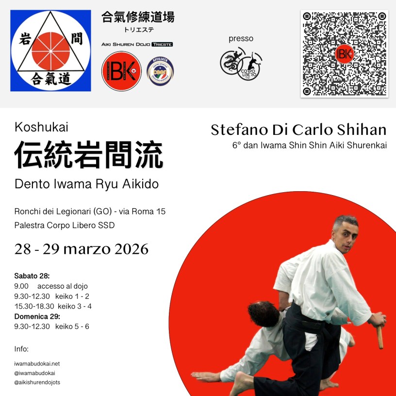 Il maestro Stefano Di Carlo Shihan, 6° dan Iwama Shin Shin Aiki Shurenkai, allievo diretto di Saito Morihiro Shihan, di Saito Hitohira Jukucho e, quindi, di Saito Morihiro Nidaime Sensei, ha magistralmente diretto un seminario di Aikido Tradizionale della Scuola di Iwama – Dentō Iwama Ryu Aikidō presso la sala maggiore di arti marziali del Corpo Libero SSD di Ronchi dei Legionari (GO) nei giorni di sabato 28 e domenica 29 marzo 2026.