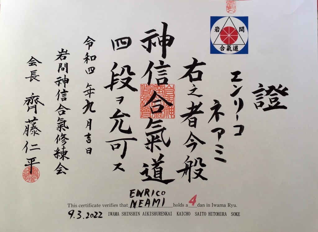 Il 3 ottobre 2022 Saito Hitohira Kaicho, in occasione del koshukai internazionale 4° Memorial Alessandro Tittarelli Shihan, gli conferisce il riconoscimento Iwama Shin Shin Aiki Shurenkai del grado yondan (cintura nera IV dan).
