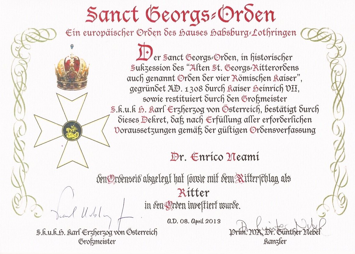 Enrico Neami è stato ritter del Sankt Georgs-Orden (Ordine di San Giorgio), ein europäischer Orden des Hauses Habsburg-Lothringen (un’Ordine della Casa d’Asburgo-Lorena), il cui Gran Maestro è S.A.R.I. l’Arciduca Karl von Habsburg-Lothringen.